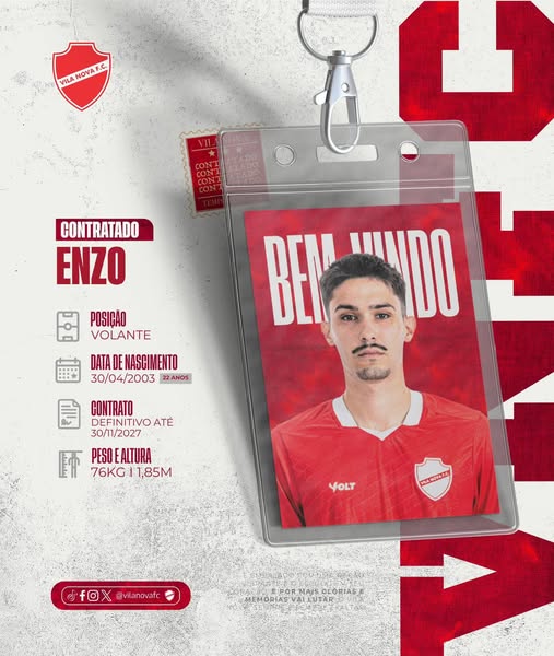 O Vila Nova apresentou dois reforços nesta quarta-feira, dentre eles o volante Enzo, que é filho do saudoso atacante Fernandão, falecido em acidente aéreo em 2014.