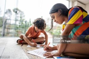Siblings painting and drawing at home