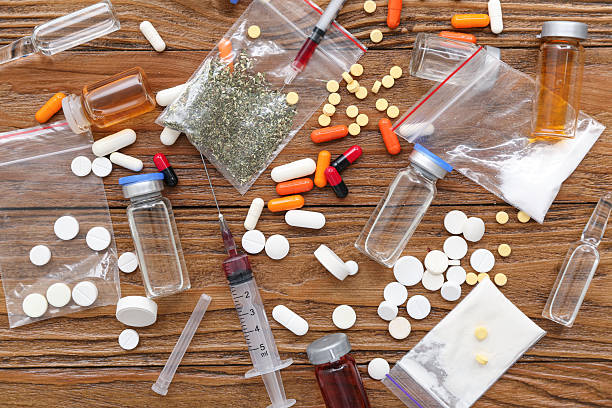 An overhead shot displaying a dangerous assortment of illicit drugs, including pills, powders in bags, and syringes, scattered across a wooden background. This stark image powerfully represents drug abuse, addiction, and the dark side of illegal substances.